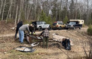 The morning started out with coffee, a drivers meeting, goody bags and door prizes (Edmund Fitzgerald trivia edition) before heading out to tackle the trash. Eighteen volunteers showed up ready to work, contributing a combined 108 hours of hands-on cleanup effort (18 volunteers x 6 hours each). Unlike last year, the group stayed together as one unit, focusing all available energy on clearing a remote dump site they were unable to reach during the previous cleanup. The extra coordination paid off, and the team was able to remove and fill a 25 yard dumpster’s worth of trash from deep within the forest near the headwaters of the Wolf River.